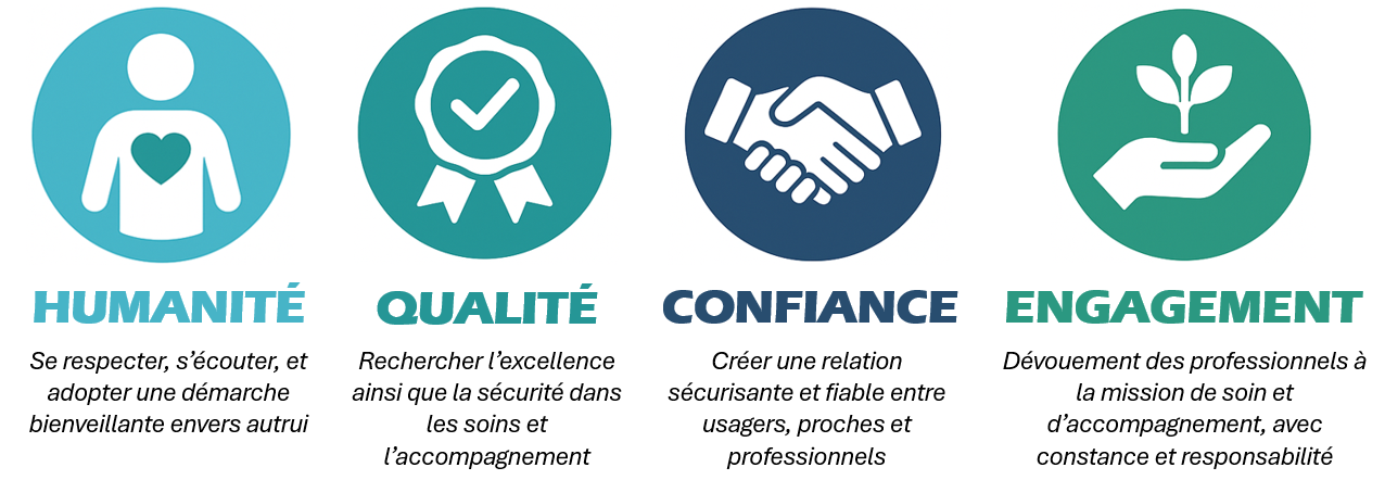 La consultation auprès des professionnels, usagers, partenaires et bénévoles de l’établissement a fait ressortir quatre valeurs communes qui seront portées par l’établissement pour les cinq prochaines années. Nous souhaitons que ces valeurs puissent être partagées collectivement, incarnées, quel que soit la fonction exercée au sein du centre hospitalier.